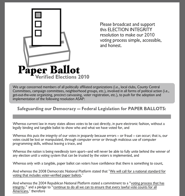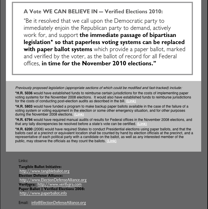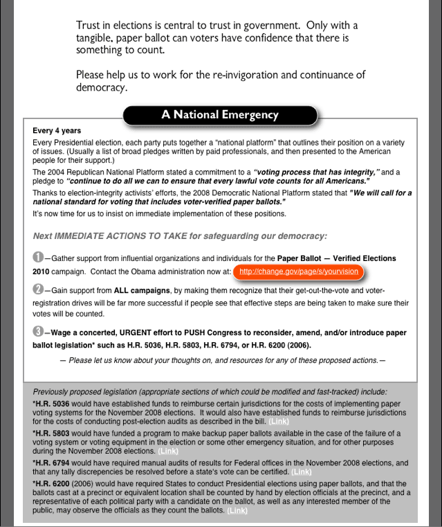 1. Go to http://change.gov/page/s/yourvision and let the President-Elect know what the people want and need from our government. 2. Please forward this email to everyone you know. [Click the "E-mail This Page" link at the foot of this article]. If they hear from millions of us, it will make a difference! Since we've recently had elections with very slim margins, no undocumented totals should be relied upon in presidential or congressional voting. All across the country, instances of paperless, electronic touch-screen (DRE’s) voting machines’ losing, misdirecting, or miscounting large numbers of votes has been well-documented. In the interest of ensuring auditable and trustworthy election results: PLEASE support immediate passage of ELECTION REFORM legislation requiring that paper ballots replace paperless, touch-screen voting systems in time for the November 2010 congressional elections. Trust in elections is central to trust in government. Only with a tangible, paper ballot can voters have confidence that there is something to count. Complete Details with Live Links at: http://www.paperballot.info/