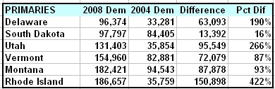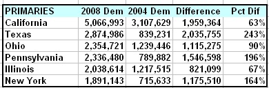 Both 2004 and 2008 were contested primaries but look at these numbers comparing the two years. Increases in new primary voters ranged from 0.8 million to 2.0 million.