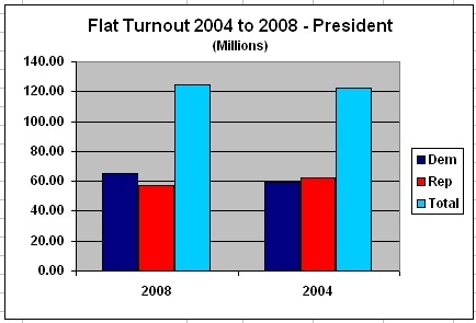 The 2004 vote total was 122 million compared to 105 million in 2000. We're left with this question. With all the excitement and effort plus a huge funding advantage for Obama, how is it that the voters going to the polls were about equal in number for 2004 and 2008?