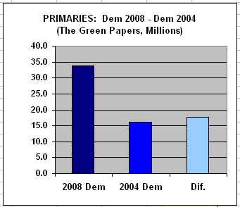 The 2008 Democratic primaries for 34 states showed 34 million voters, twice as many when compared to 2004. In fact, the difference between the two years, 17.6 million, is greater than the vote total for the same 2004 primaries, 16.1 million.