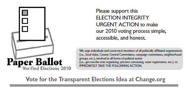 There are two HCPB (hand-counted paper ballot) proposals in two different categories. Clearly, EDA advocates HCPB solutions to the election crisis. But neither of the HCPB proposals have nearly enough votes to survive the elimination round. We recommend voting for them anyhow. There is no penalty for multiple voting, and every vote counts. Maybe the 1048 members of this EDA news alert list can do something to improve those numbers between now and midnight -- especially the 94 of you who have offered to forward EDA announcements on to your own e-mail lists! You can vote for each of the 3 EI proposals using the widgets embedded on this page. And, you can FORWARD this message right now by clicking the E-mail this article link at the foot of this page. In the Other category, a HCPB proposal called "Return to citizen-run, citizen-counted, citizen monitored elections" is currently in 57th Place in Other and needs 1858 more votes to make it into the second round. Here are the top 3 issues in the Other category: 3,310 votes, Appoint Secretary of Peace in Department of Peace and Non-Violence 1,989 votes, Repeal the Patriot Act 1,921 votes, End Corporate "Personhood" Return to citizen-run, citizen-counted, citizen monitored elections reads in part: Control of elections must be taken back from corporations, whose procedures right now and for the last several election cycles equate to secret vote counting (with secret software and non-transparent procedures -AND brought back into the hands of citizens through hand-counted paper ballot elections - WITH enhanced security procedures such as video cameras on the ballot box - WITH citizens monitoring all day - WITH ballot boxes never leaving the table until 7pm when the box seals are broken and multi-partisan teams of citizens count all the votes until they all agree on the totals...AND TOTALS are posted, as Tom said, AT THE PRECINCT LEVEL. In this way, ballot boxes are extremely difficult if not impossible to stuff; ballot boxes may end up in the river or in the trunk of someone's car, but only after all the votes are counted. If any other computerized counting device is used as a second count, the hand count MUST be the "count of record" or the real results can easily be subverted. For the full text, see: http://www.change.org/ideas/view/return_to_citizen-run_citizen-counted_c... To vote for it now, click the widget: